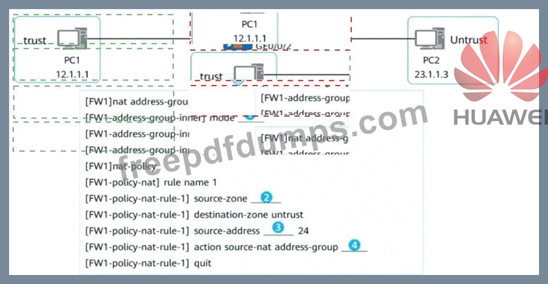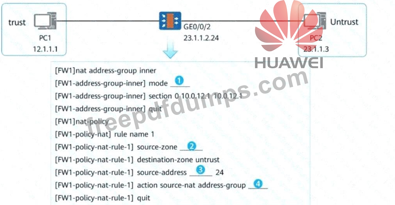 To enable PC1 to access PC2 using the IP address of the firewall's GE0/0/2, you need to configure NAPT for source address translation. In the following figure, fill in the blank to complete the command.