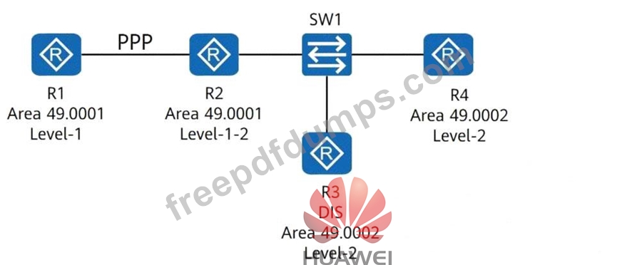 Four routers run IS-IS and have established adjacencies. The area IDs and router levels are marked in the following figure. R1 and R2 are connected through a PPP link, and R3 is the DIS. Which of the following statements are true?