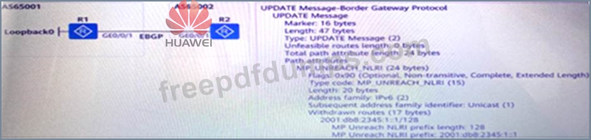The engineer used two routers to test the IPv6 service and simulated the interconnection between the headquarters and the branch by running BGP4+. As shown in the figure, an engineer captured the packet to check the Updte message sent by R1. Regarding the description of the message information, which of the following statements are correct? (Multiple choice)