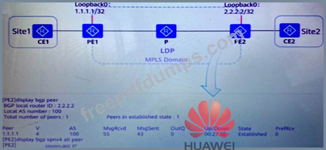 As shown in the figure, MPLS/BGP IPVPN is deployed in the network. The MP-BGP neighbor relationship is established between PE1 and PE2 through the LoopbackD interface. After the configuration is completed, it is found that CE1 and CE2 cannot learn routes from each other. Use the command on PE2 to query neighbor information as shown in the figure. What is the most likely cause of the problem?