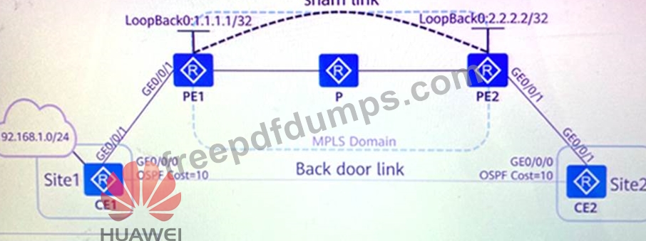 As shown in the figure, a sham link is established between PE1 and PE2 through the LoopBackD interface. CE2 can learn the route to the 192.168.1.0/24 network segment (the direct route on CE1) through the sham link and backdoor link. If you keep the default configuration, the cost value of the route from CE2 to the 192.168.1.0/24 network segment should be (). (Please fill in the Arabic numerals directly, without symbols)
