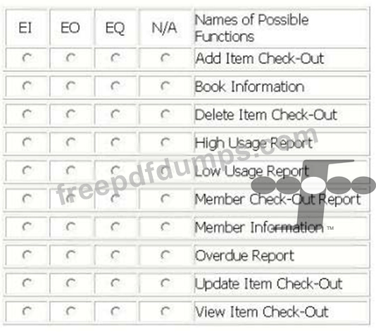 -From the Names of Possible Functions listed identify the transactional functions for the current Library Check-Out application. Select N/A if a Name of Possible Function does not apply.