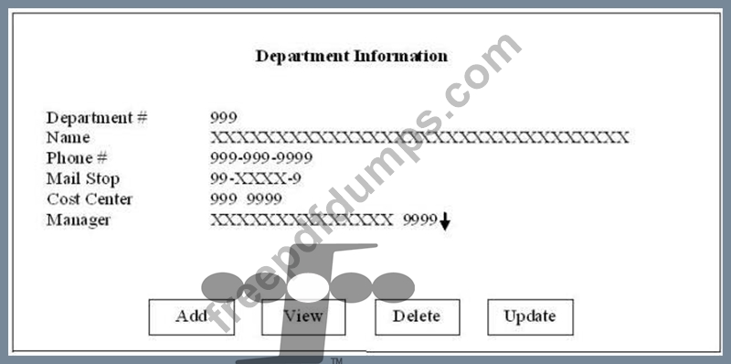 -The user Adds a new department by entering department #, Name, phone #, mail stop, cost center and manager. The user completes the add by pressing the Add button. An error message displayed if the department # already exists.