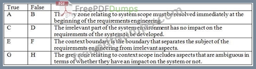 In requirements engineering, a differentiation is made between system scope and context scope. In both cases it is possible that so-called grey zones may appear. For each statement, indicate if it is true or false. (2 Points)