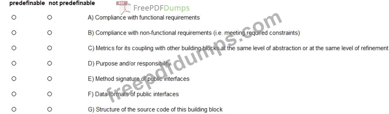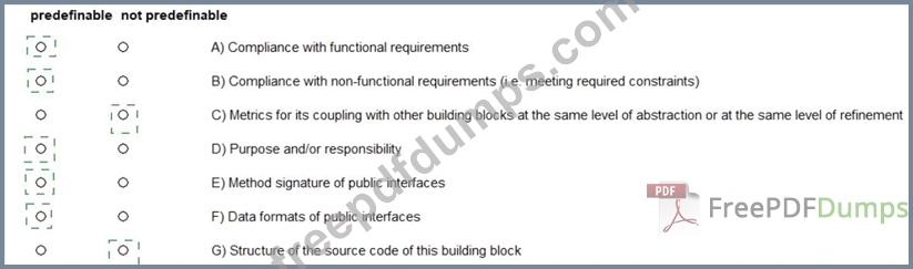 * Compliance with Functional Requirements (A): This refers to the ability of the building block to perform the functions it was designed to do, which are often captured in a functional specification document.