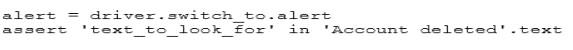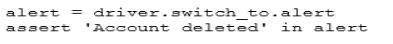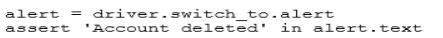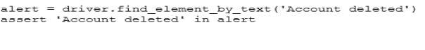 Given that only one alert message in your web application says. "Account deleted", which line(s) of code will allow you to know that the "Account deleted" alert is displayed?
