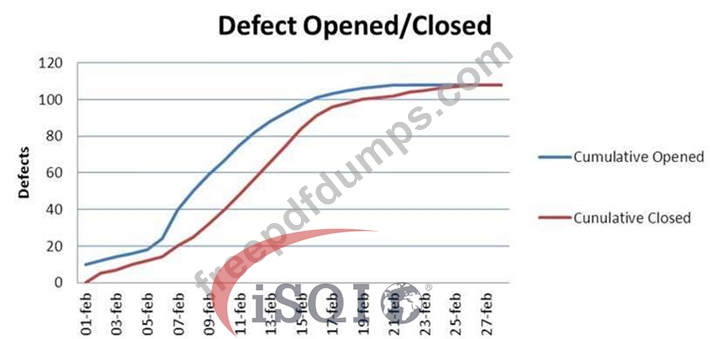 The following chart plots the cumulative number of defects opened against the cumulative number of defects closed during system testing of a software product.