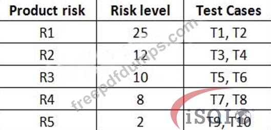 You have decided to adopt a risk-based testing strategy: 5 product risks (R1, R2, R3, R4, R5) have been identified and their levels of risk have been assessed. 10 test cases (T1, ..., T10) have been designed to cover all the product risks.