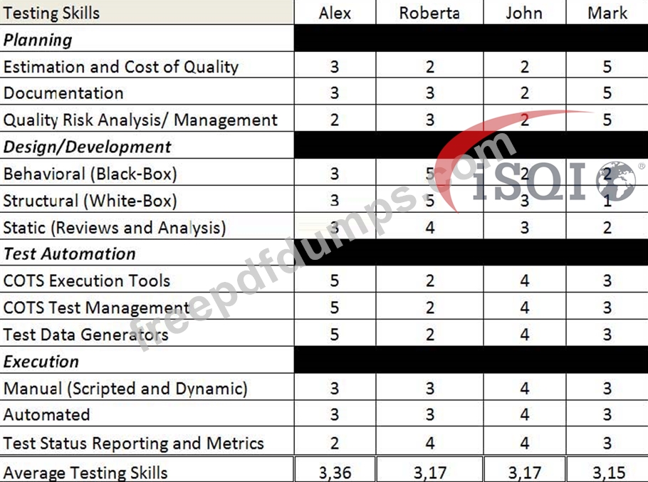 Consider the following skills assessment spreadsheet for your test team (consisting of four team members):