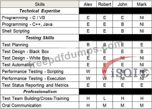 Consider the following skills assessment spreadsheet for your test team (consisting of four team members):