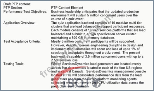 You have been asked to test the performance of a software and system update to a North American mobile trivia quiz game application.The quiz app is available on major app stores serving English-speaking users.The number of concurrent users planned for is 5 million Winning quiz participants are promised a share of an allocated cash prize Once participants start playing, their quiz sessions must not be lost especially if all previous questions were answered correctly. The application owner wants to ensure that 99% of quiz sessions are maintained (up to 4.95 million sessions) until the last answer has been successfully recorded.