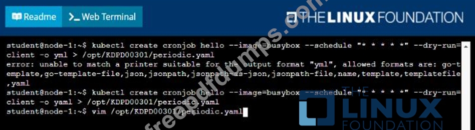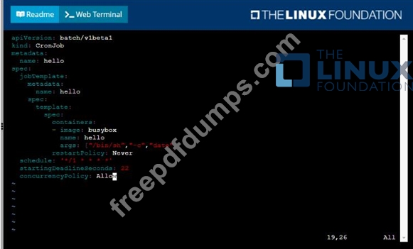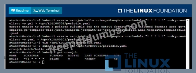 * Create a YAML formatted Kubernetes manifest /opt/KDPD00301/periodic.yaml that runs the following shell command: date in a single busybox container. The command should run every minute and must complete within 22 seconds or be terminated oy Kubernetes. The Cronjob namp and container name should both be hello