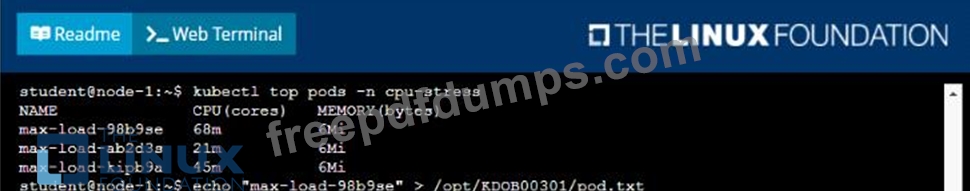 * From the pods running in namespace cpu-stress , write the name only of the pod that is consuming the most CPU to file /opt/KDOBG030l/pod.txt, which has already been created.