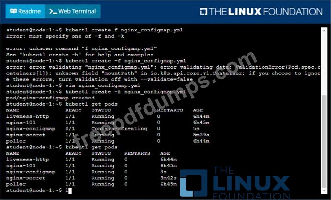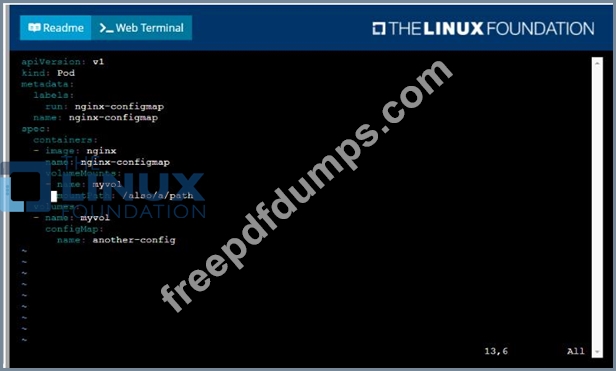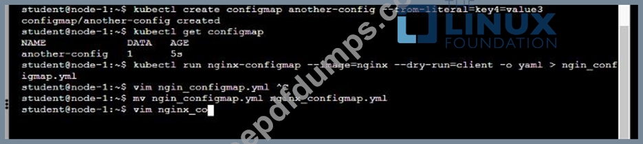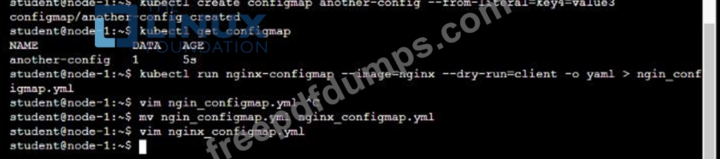 * Create a ConfigMap named another-config containing the key/value pair: key4/value3