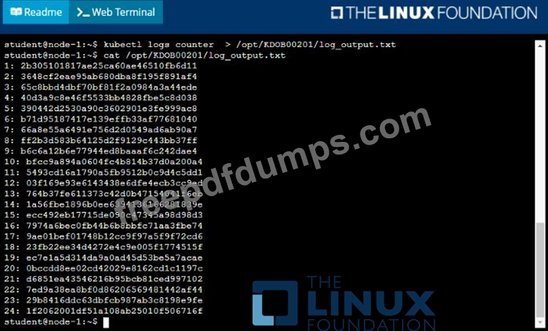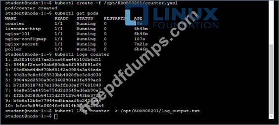 * Deploy the counter pod to the cluster using the provided YAMLspec file at /opt/KDOB00201/counter.yaml
