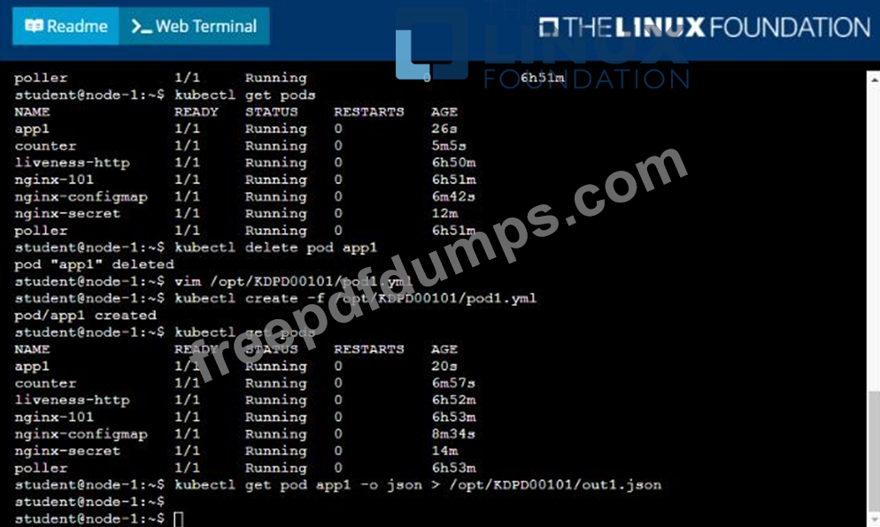 * When the pod is running display summary data about the pod in JSON format using the kubect1 command and redirect the output to a file named /opt/KDPD00101/out1.json