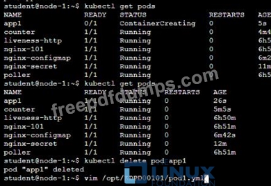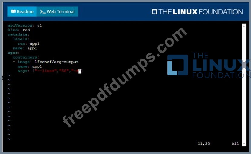 /opt/KDPD00101/podl.yml to create a pod named app1 that runs a container named app1cont using image Ifccncf/arg-output with these command line arguments: -lines 56 -F