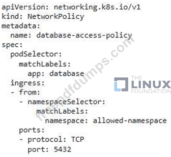Your Kubernetes cluster runs a Deployment named 'database' which exposes a database service. You need to implement a NetworkPolicy that allows only pods belonging to a specific namespace to access the database service.