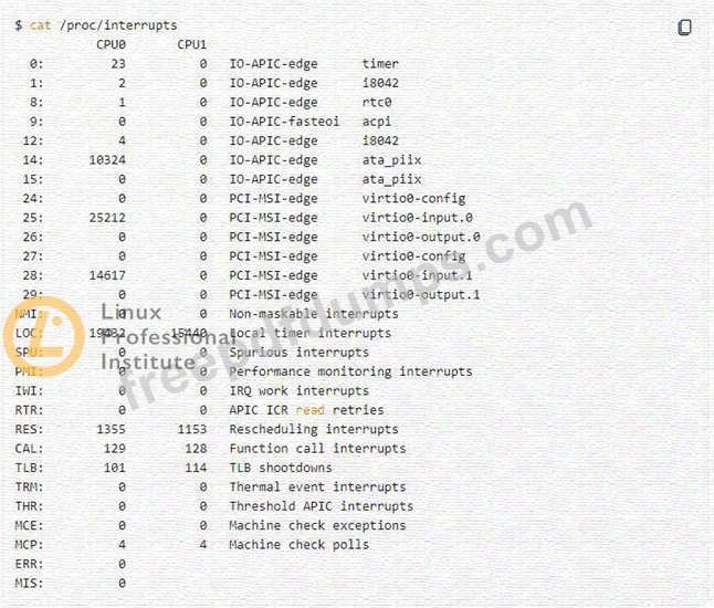 The file that you should check within the /proc tree to learn which IRQs are being used by which kernel drivers is /proc/interrupts1 Comprehensive Explanation: The /proc/interrupts file is a virtual file that provides information about the number and type of interrupts per CPU per I/O device12. It displays the IRQ number, the number of that interrupt handled by each CPU core, the interrupt type, and a comma-delimited list of drivers that are registered to receive that interrupt12. For example, the following output shows the contents of /proc/interrupts on a system with two CPUs and several devices: