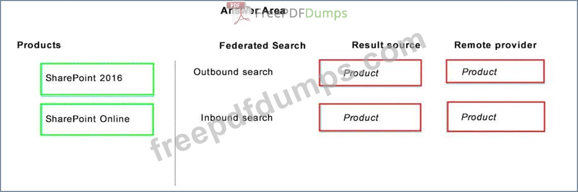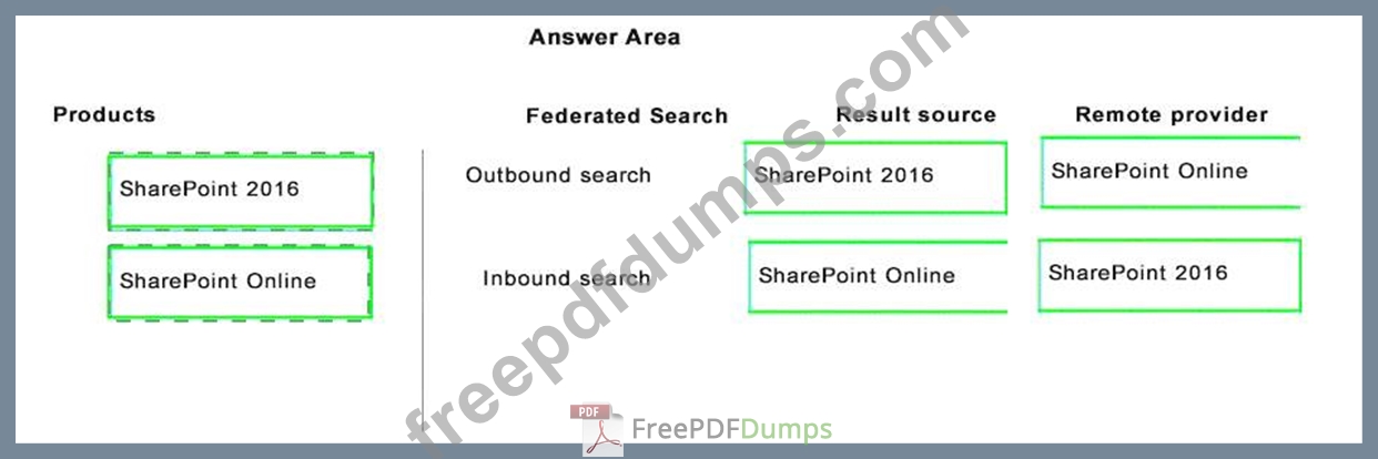 How should you configure federated search? To answer, drag the appropriate option to the correct result source and remote providers. Each option may be used once, more than once, or not at all. You may need to drag the split bar between panes or scroll to view content.