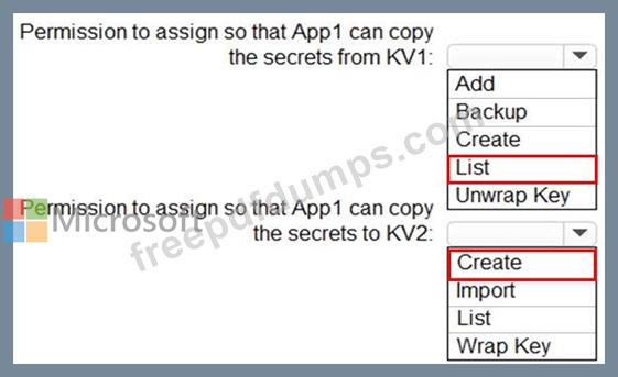 You need to configure permissions so that App1 can copy all the secrets from KV1 to KV2. App1 currently has the Get permission for the secrets in KV1.