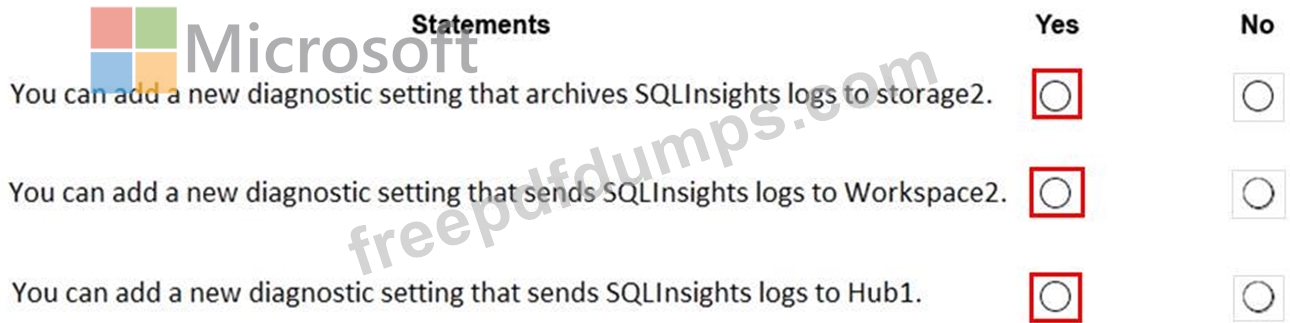 To DB1, you add a diagnostic setting named Settings1. Settings1 archives SQLInsights to storage1 and sends SQLInsights to Workspace1.