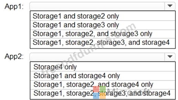 Which storage accounts should you recommend using for each app? To answer, select the appropriate options in the answer area.