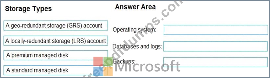 Which storage type should you recommend for each data type? To answer, drag the appropriate storage types to the correct data types. Each storage type may be used once, more than once, or not at all. You may need to drag the split bar between panes or scroll to view content.