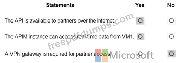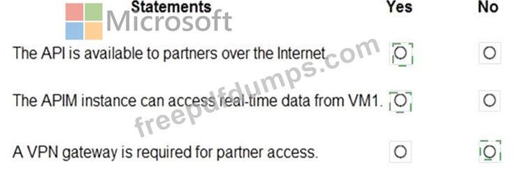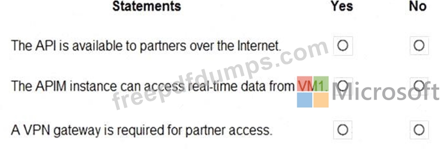 The chief technology officer (CTO) sends you the following email message: "Our developers have deployed the web service to a virtual machine named VM1. Testing has shown that the API is accessible from VM1 and VM2. Our partners must be able to connect to the API over the Internet. Partners will use this data in applications that they develop." You deploy an Azure API Management (APIM) service. The relevant API Management configuration is shown in the API exhibit. (Click the API tab.)