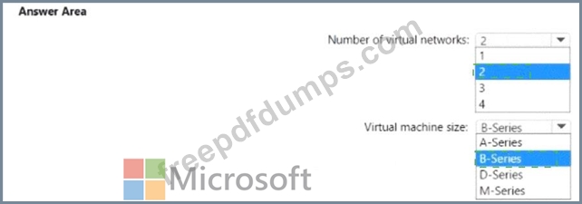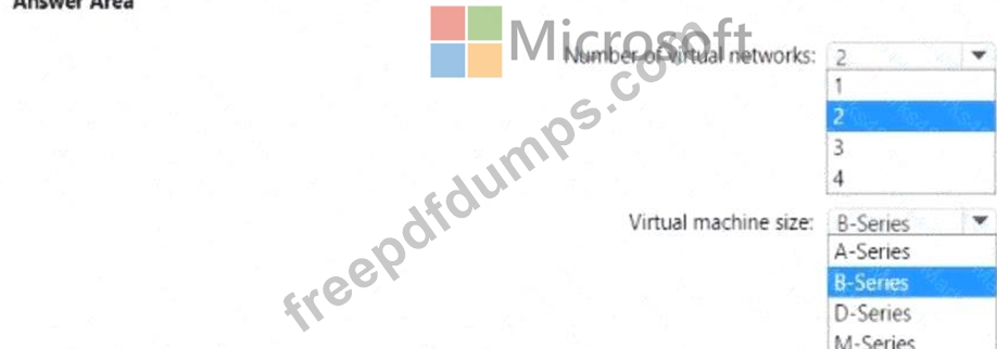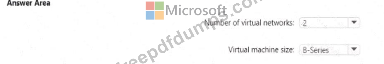 What is the minimum number of virtual networks you should deploy, and which virtual machine size should you use? To answer, select the appropriate options in the answer area.