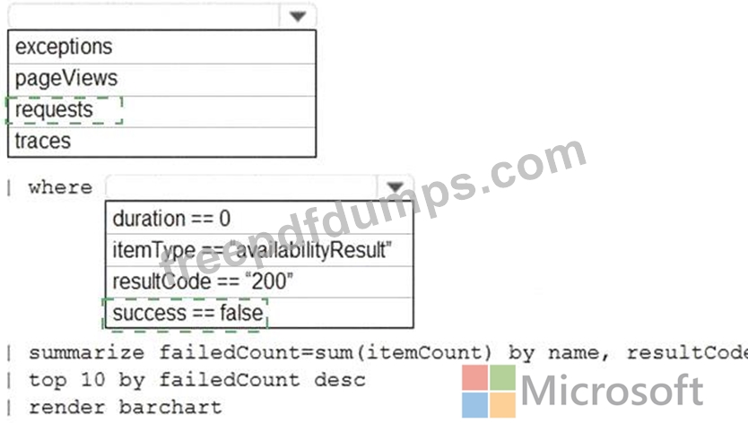 You need to use an Azure Monitor query to create a report that details the top 10 pages of Webapp1 that failed.