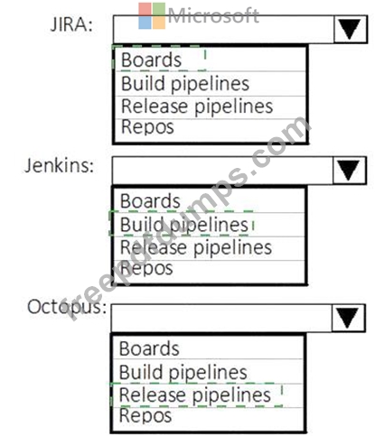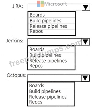 Which AzureDevOps service should you use to replace each tool? To answer, select the appropriate options in the answer area.
