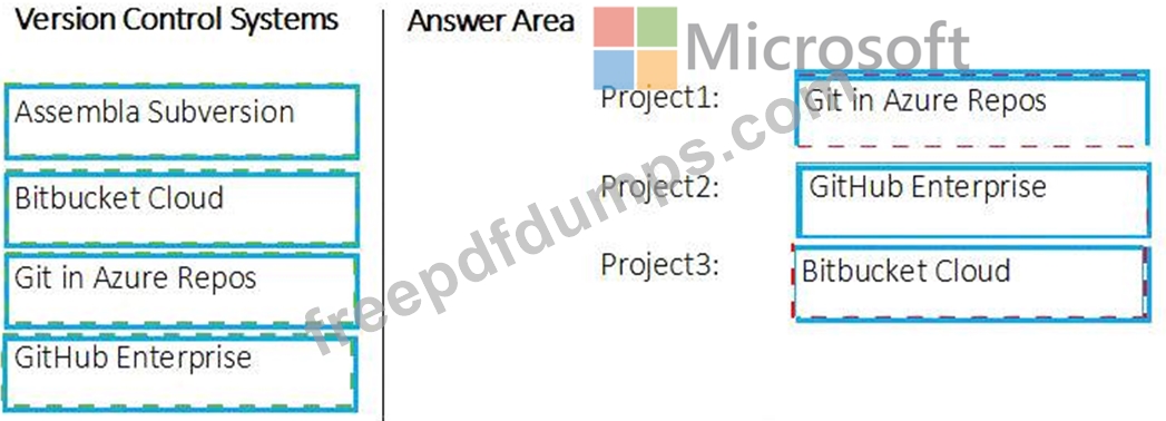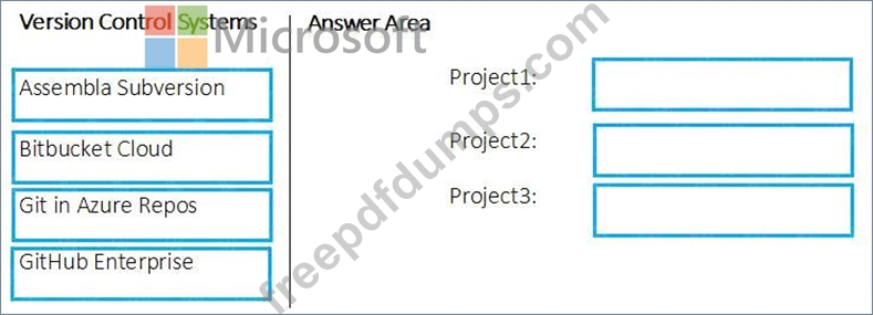 Which version control system should you recommend for each project? To answer, drag the appropriate version control systems to the correct projects. Each version control system may be used once, morethan once, or not at all. You may need to drag the split bar between panes or scroll to view content.