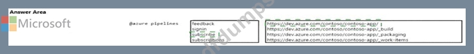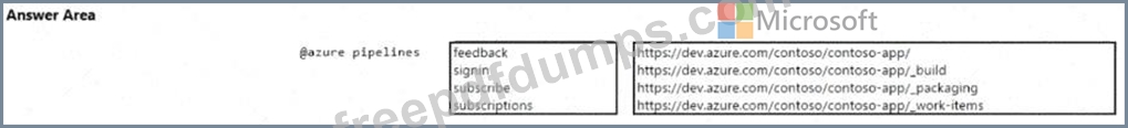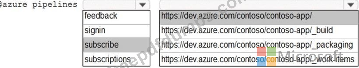 You have a project in Azure DevOps named Contoso App that contains pipelines in Azure Pipelinesfor GitHub repositories. You need to ensure that developers receive Microsoft Teams notifications when there are failures in a pipeline of Contoso App. What should you run in Teams? To answer, select the appropriate options in the answer area. NOTE: Each correct selection is worth one point.