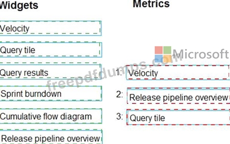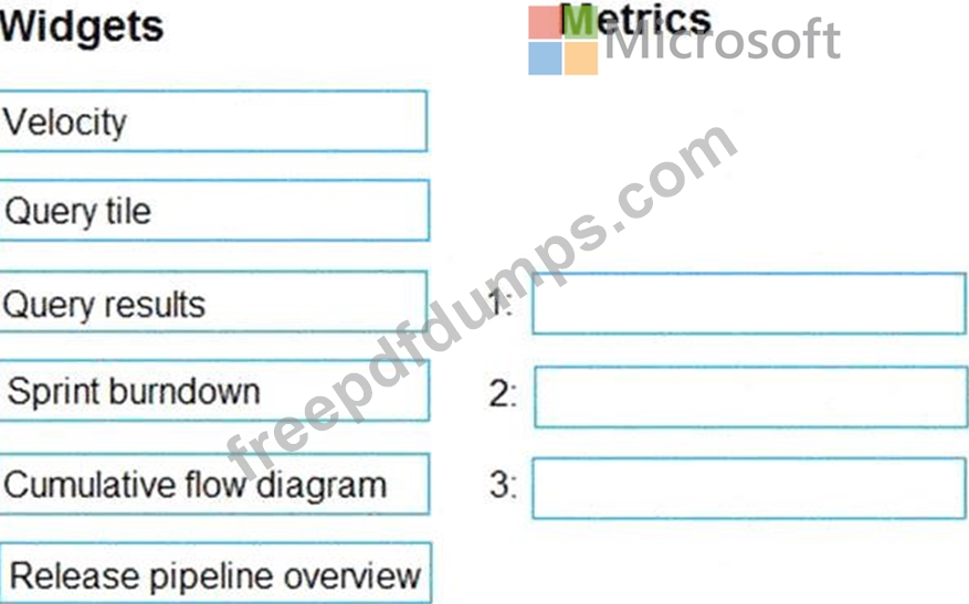 Which widget should you use for each metric? To answer, drag the appropriate widgets to the correct metrics.