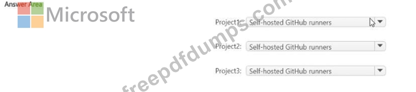 You need to recommend an architecture for the GitHub runners of the projects. The solution must minimize costs. What should you recommend for each project? To answer, select the appropriate options in the answer area.