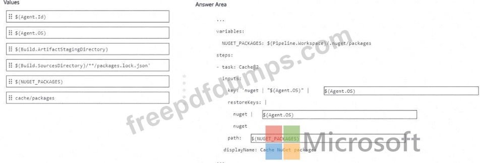 How should you configure thepipeline? To answer, drag the appropriate values to the correct targets. Each value may be used once, more than once, or not at all. You may need to drag the split bar between panes or scroll to view content.