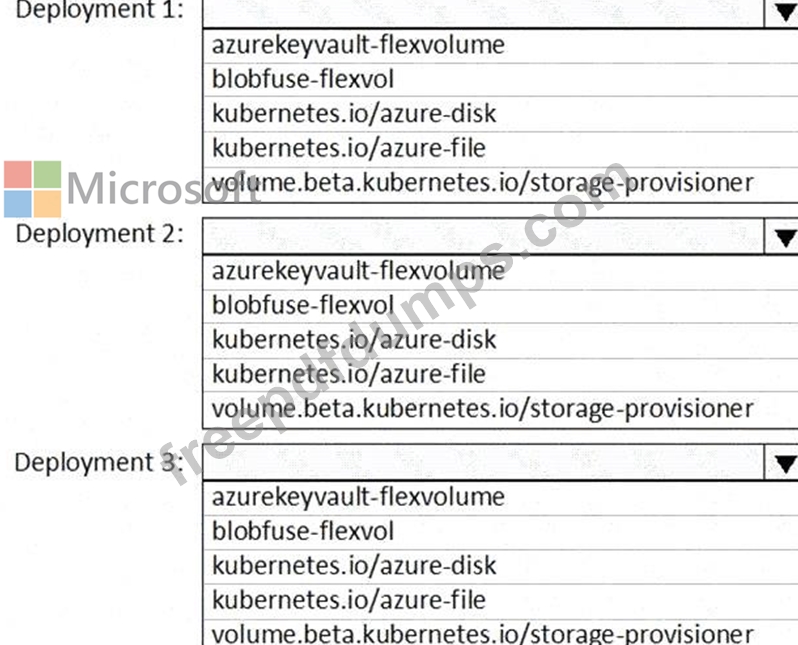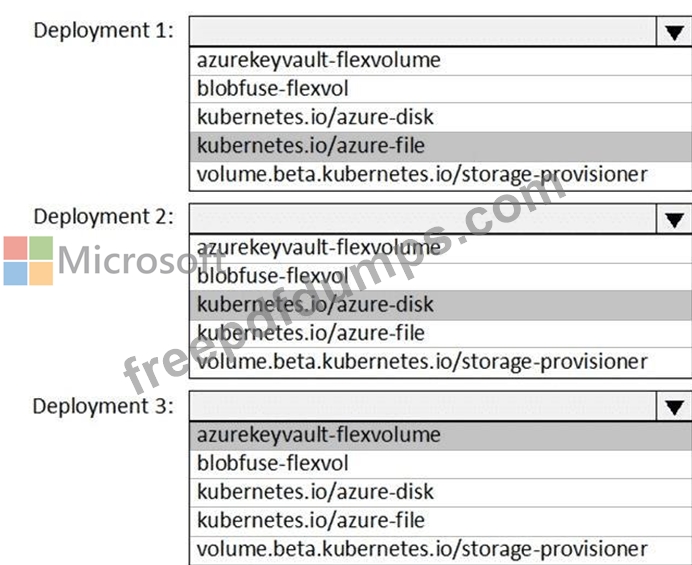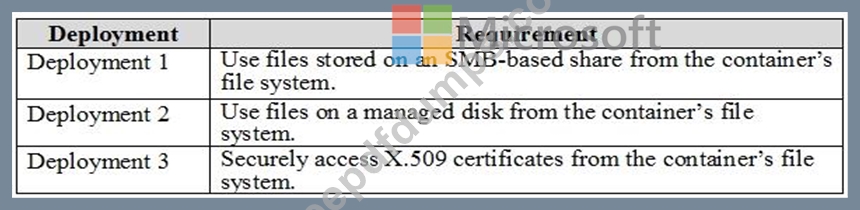 You needto create deployment files for an Azure Kubernetes Service (AKS) cluster. The deployments must meet the provisioning storage requirements shown in the following table.