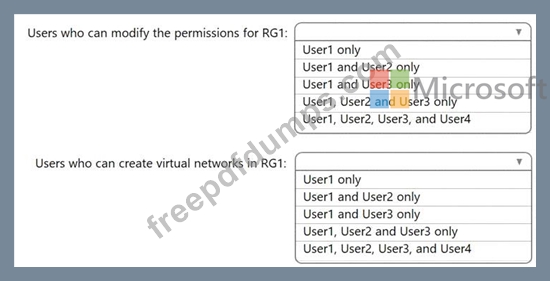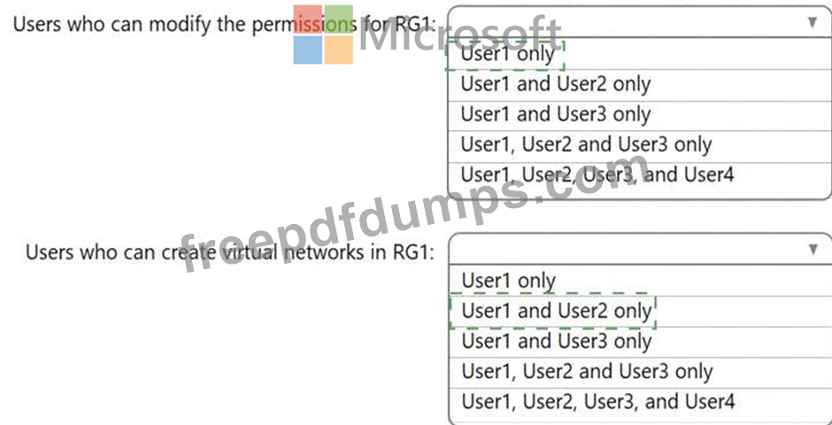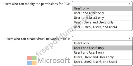 Which users can modify the permissions for RG1 and which users can create virtual networks in RG1? To answer, select the appropriate options in the answer area.