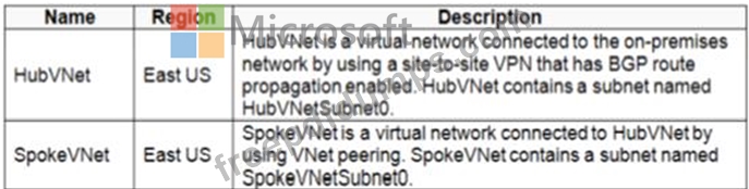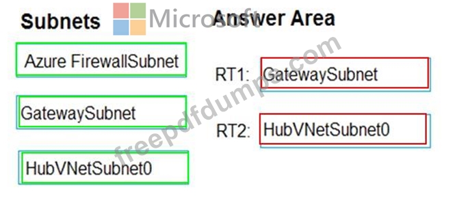 RT1: Includes a user-defined route that points to the private IP address of the Azure firewall as a next hop address RT2: Disables BGP route propagation and defines the private IP address of the Azure firewall as the default gateway You need to ensure that traffic between SpokeVNetSubnet0 and the on-premises network flows through the Azure firewall.