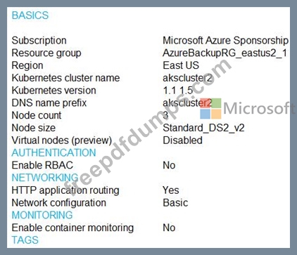 You are testing an Azure Kubernetes Service (AKS) cluster. The cluster is configured as shown in the exhibit. (Click the Exhibit tab.)