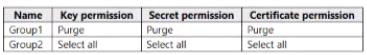 You have an Azure key vault named Vault1 that has Purge protection set to Disabled. Vault1 contains the access policies shown in the following table.
