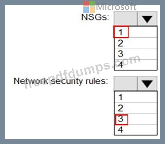 How many NSGs and network security rules should you create? To answer, select the appropriate options in the answer area.