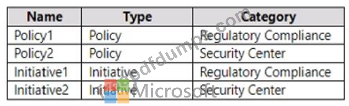 You have an Azure subscription that uses Microsoft Defender for Cloud. The subscription contains the Azure Policy definitions shown in the following table.