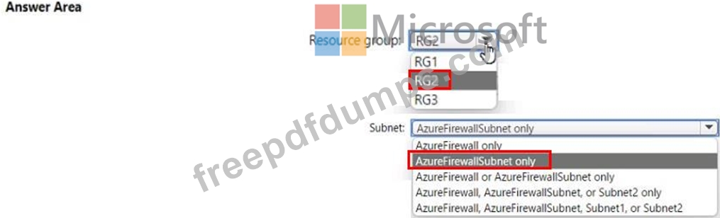 Which resource group and subnet can you use to deploy AzFW1? To answer, select the appropriate options in the answer area.