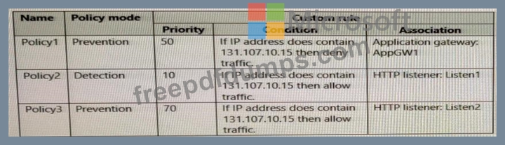 You create Azure Web Application Firewall (WAF) policies for AppGW1 as shown in the following table.