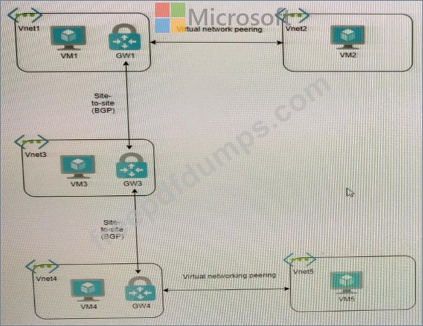 You have virtual network peering between Vnet1 and Vnet2. You have virtual network peering between Vnet4 and Vnet5. The virtual network peering is configured as shown in the following table.