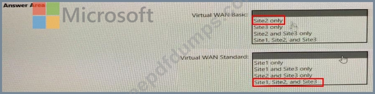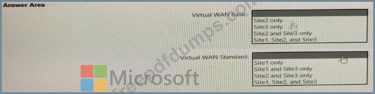 Which type of Virtual WAN can you use for each site? To answer, select the appropriate options in the answer area.