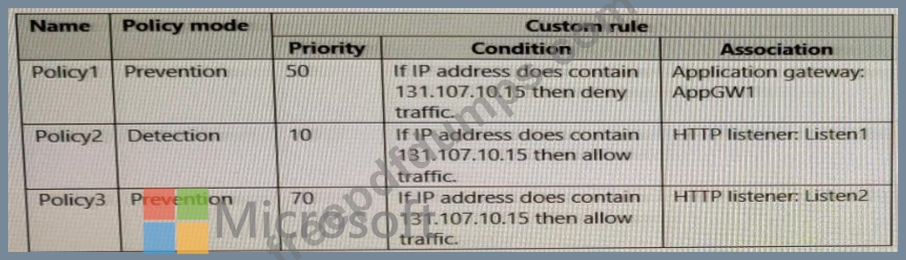You create Azure Web Application Firewall (WAF) policies for AppGW1 as shown in the following table.