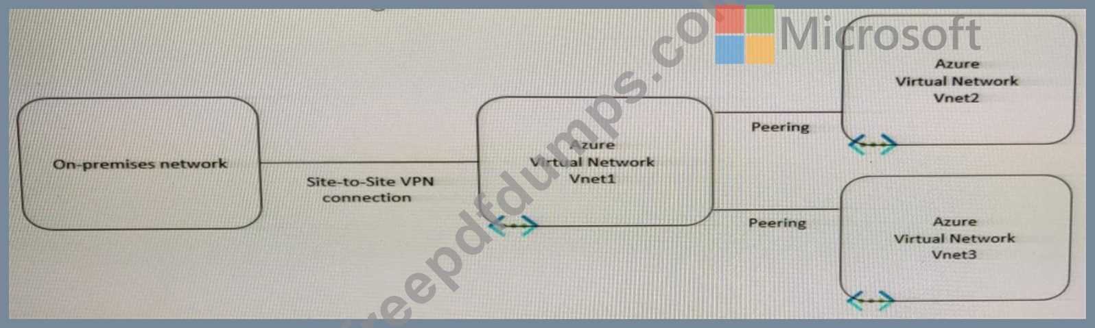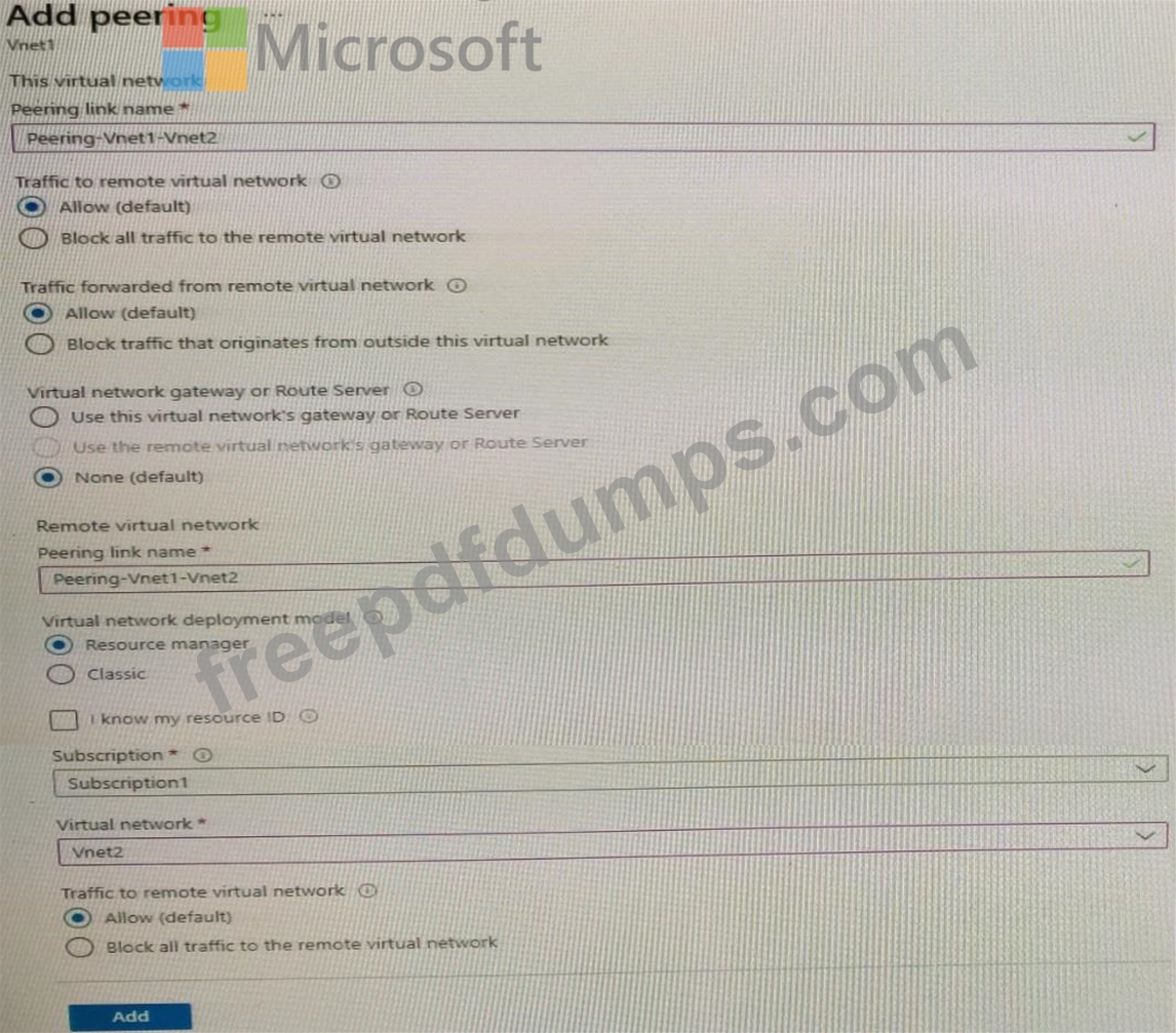 You have a peering connection between Vnet1 and Vnet2 as shown in the Peering-Vnet1-Vnet2 exhibit.